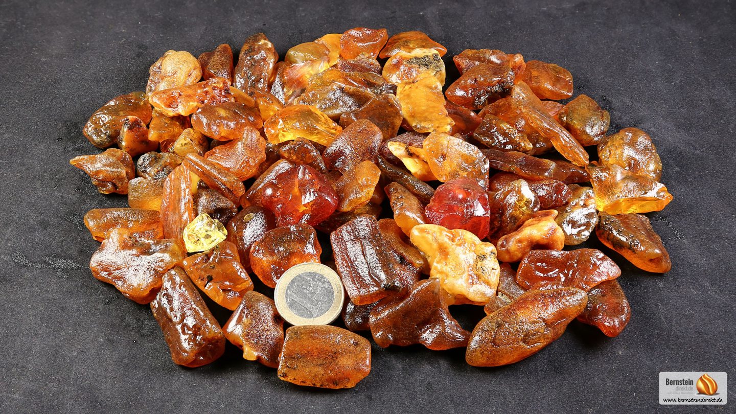 Die Bernsteine sind ca. 2 bis 5 Gramm groß, vorgewaschen und frei von Sediment. Sie sind unbehandelt und eignen sich hervorragend zum Schleifen und Polieren.