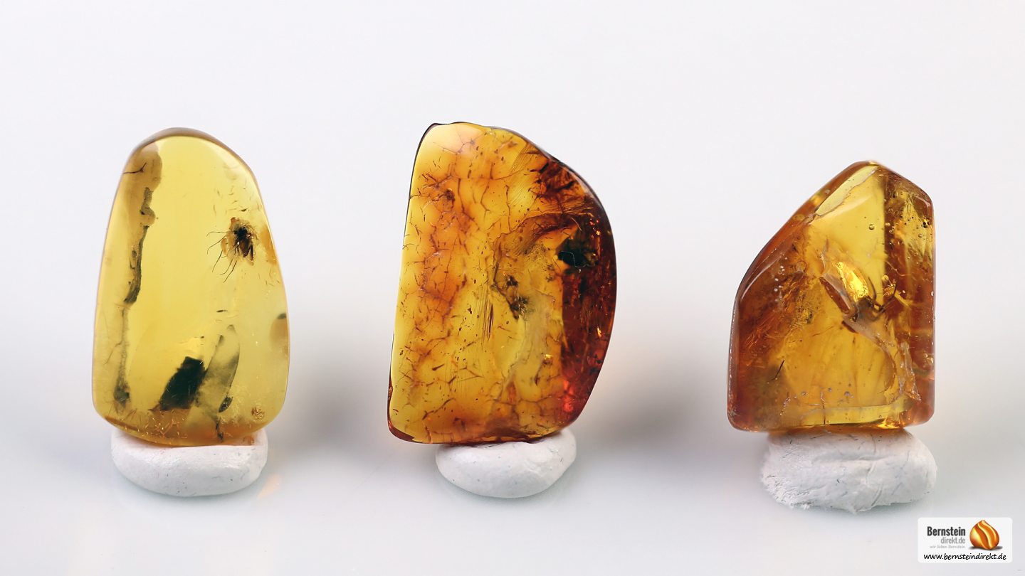 Es kann nicht ganz ausgeschlossen werden, dass manche der Inklusen verlumpt oder leicht beschädigt sind (z.B. eine kleine Öffnung in den Hohlraum, wobei auch dies interessant sein kann). Die Bernsteine wurden von Hand geschliffen und poliert und haben ein Gesamtgewicht von 2,46 Gramm.