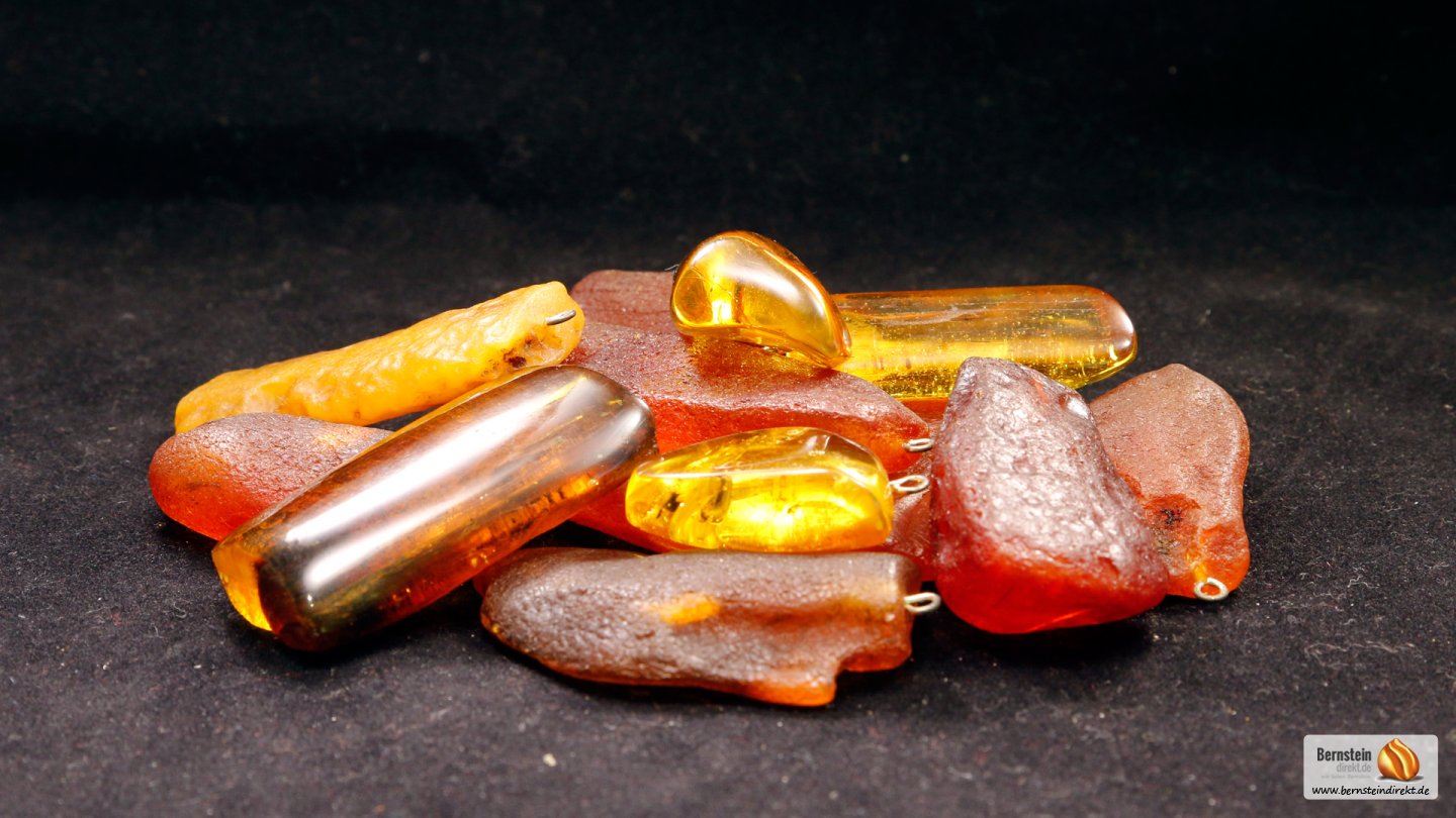 Individuelle Bernsteinanhänger unbehandelt, wie die Natur sie schuf, oder von Hand geschliffen und poliert.