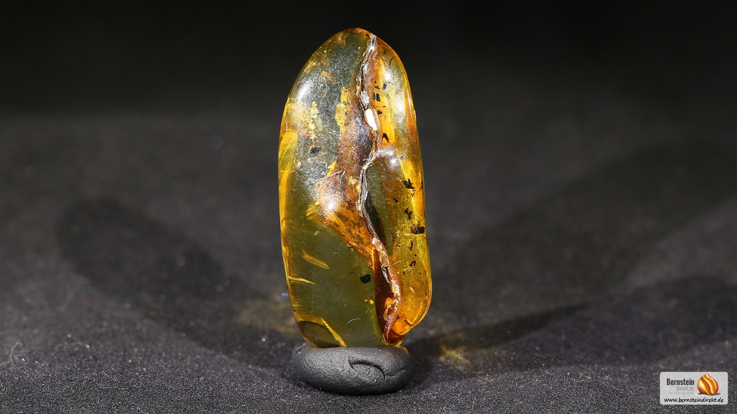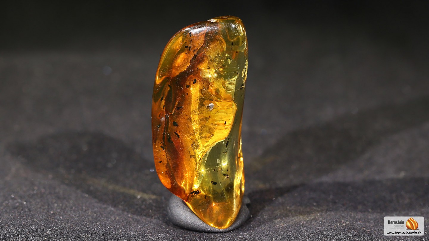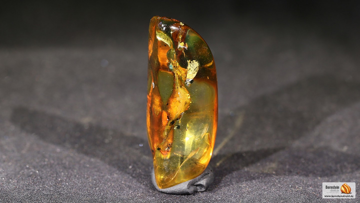 Allgemeine Beschreibung Ein 9,6 Gramm großer Bernstein überwiegend klar, geschliffen und poliert. Der Bernstein wurde durch Erhitzen geklärt um ihn fester zu machen und eventuelle Trübungen zu entfernen. Durch die verbesserte Festigkeit und Härte eignet es sich besonders gut als Schmuckstein. Eine sehr schöne Stalaktitenform, die Farbe ist leichtrot bis honiggelb. Im Bernstein ist eine ältere Harzschicht zu sehen, eine Art Bernstein im Bernstein. Herkunft: AndereVarietät: Klar, klargelber BernsteinArtikelnummer: BN1801030 Maße und GewichtMaße: 47,6 x 18,5 x 17,0Gewicht: 9,60 g