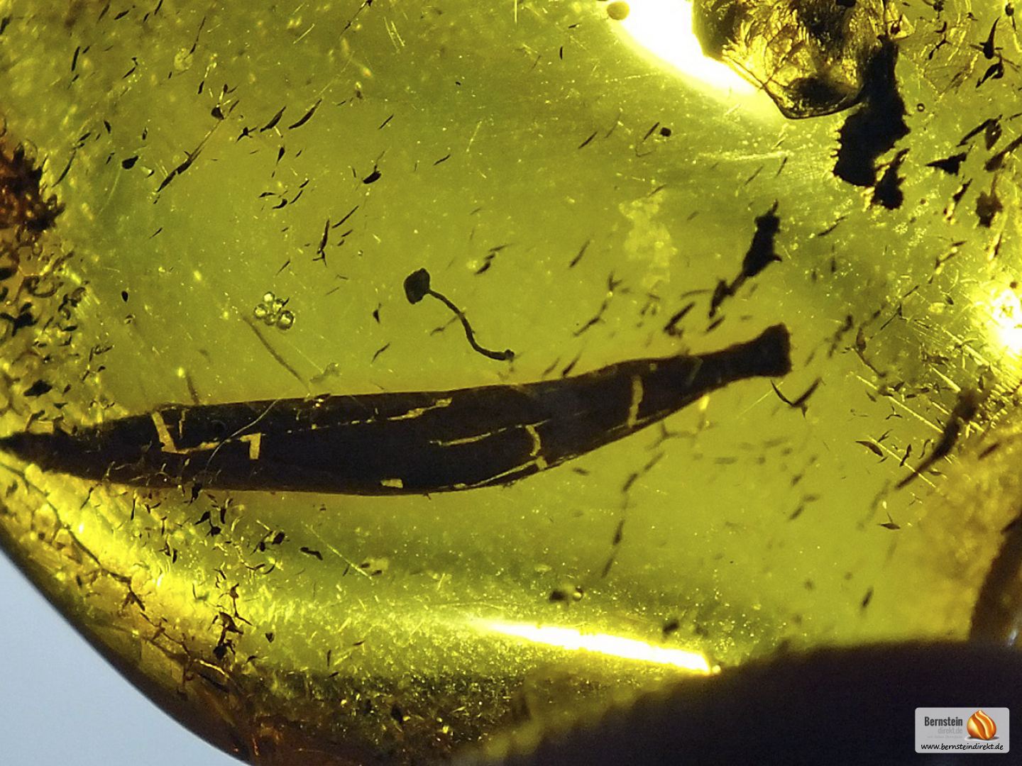 Allgemeine BeschreibungEin Blatt als Inkluse in einem Bernstein. Blatt als pflanzlicher Einschluss in einem Baltischen Bernstein. Herkunft: Baltischer Bernstein (Succinit)